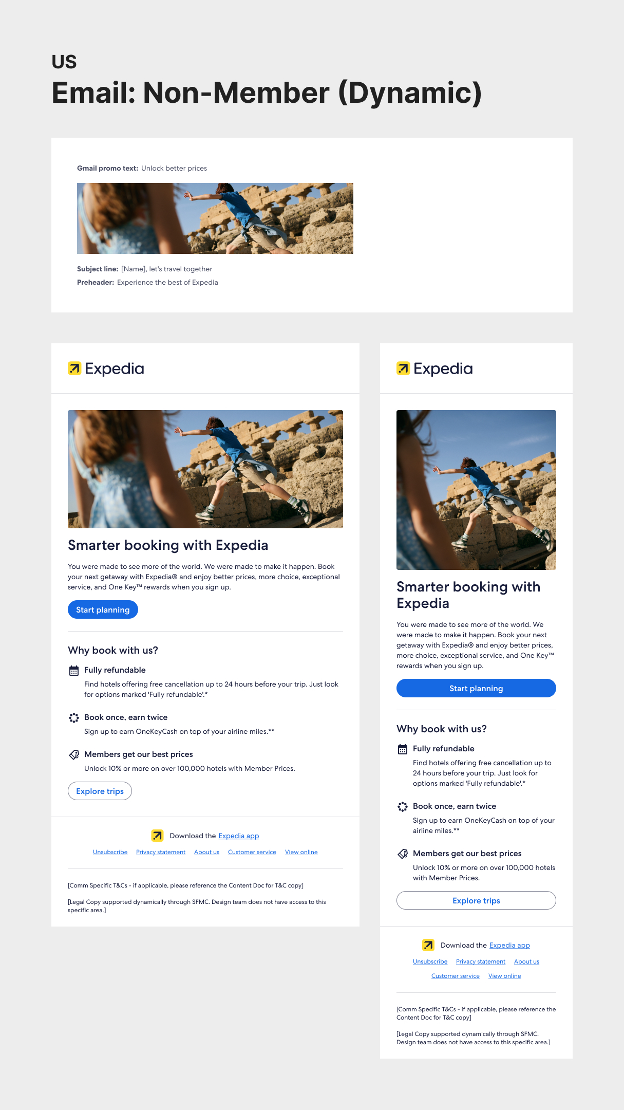 This is a selection of email mockups for Expedia and Hotels.com. These marketing campaigns were produced through lots of planning and collaboration within Expedia Group. These email mockups were created in Figma using all of the brand elements in the various templates including brand specific colors, icons, list formatting, and buttons are integrated when they are needed in each template.