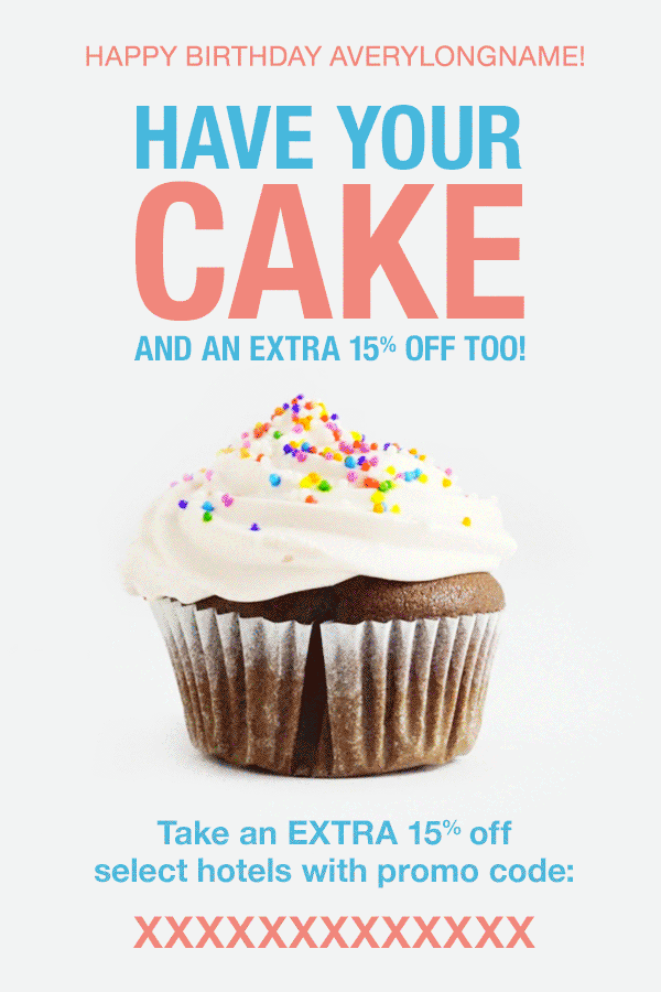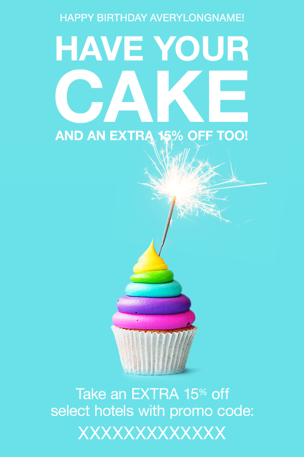 The teal background email with the sparkler on a cupcake was sent out to Orbitz members. The white background, blue and pale red type, and cupcake with sprinkles email was sent out to Cheaptickets. The “AVERYLONGNAME!” text is a placeholder that would be populated dynamically with the recipient’s first name. The “XXXXX” at the bottom is a placeholder for the promo code which was added later.