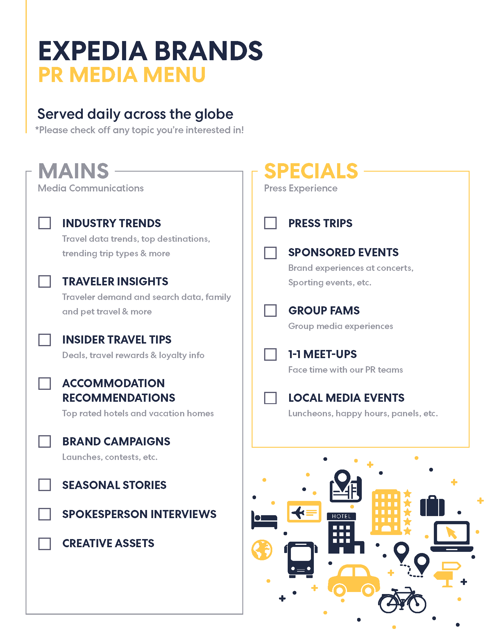 This is print over view of the topics covered an Expedia Brands PR Media conference weekend hosted by Expedia Group in 2022. The team requested a restaurant menu style layout presenting the different topics covered in the conference.