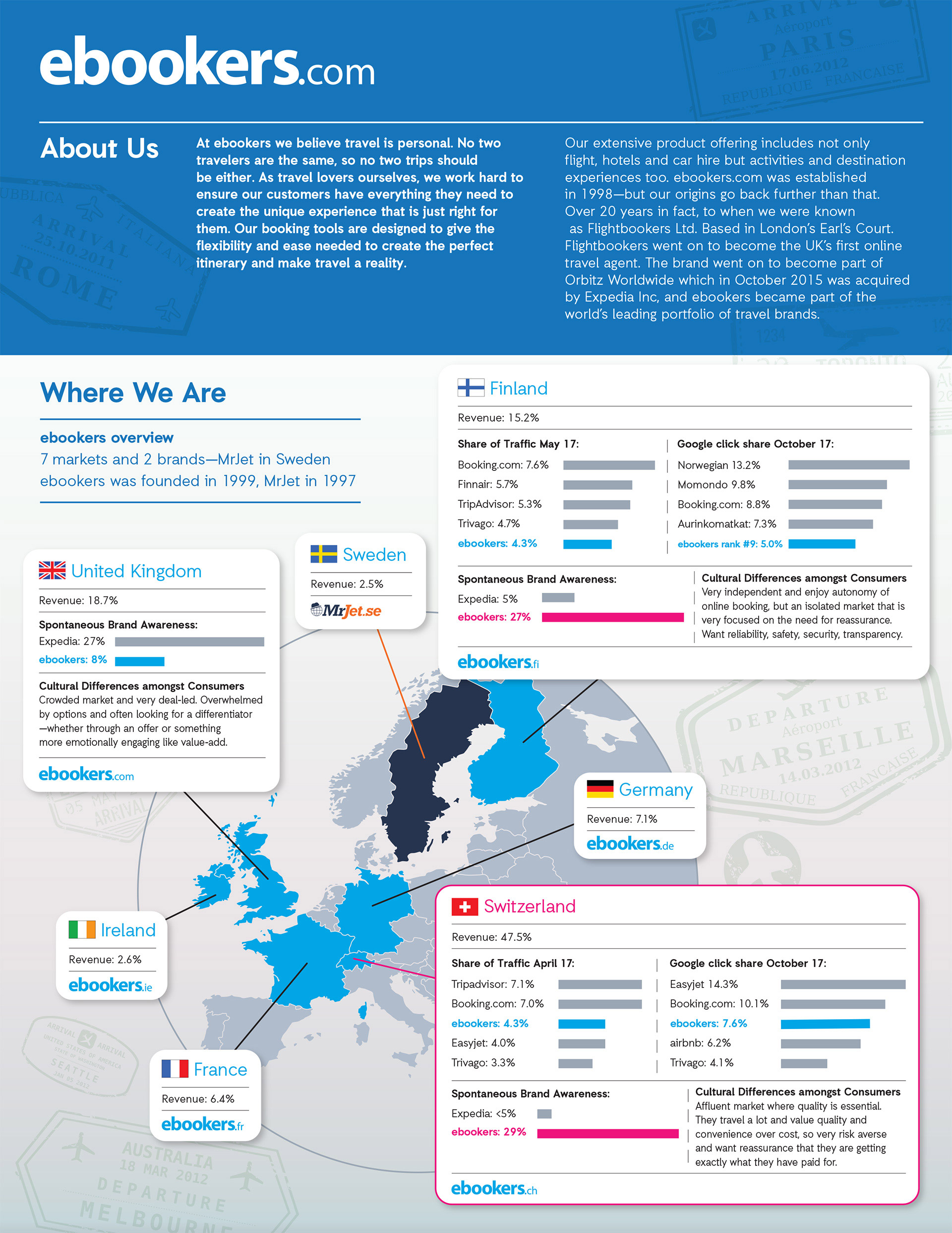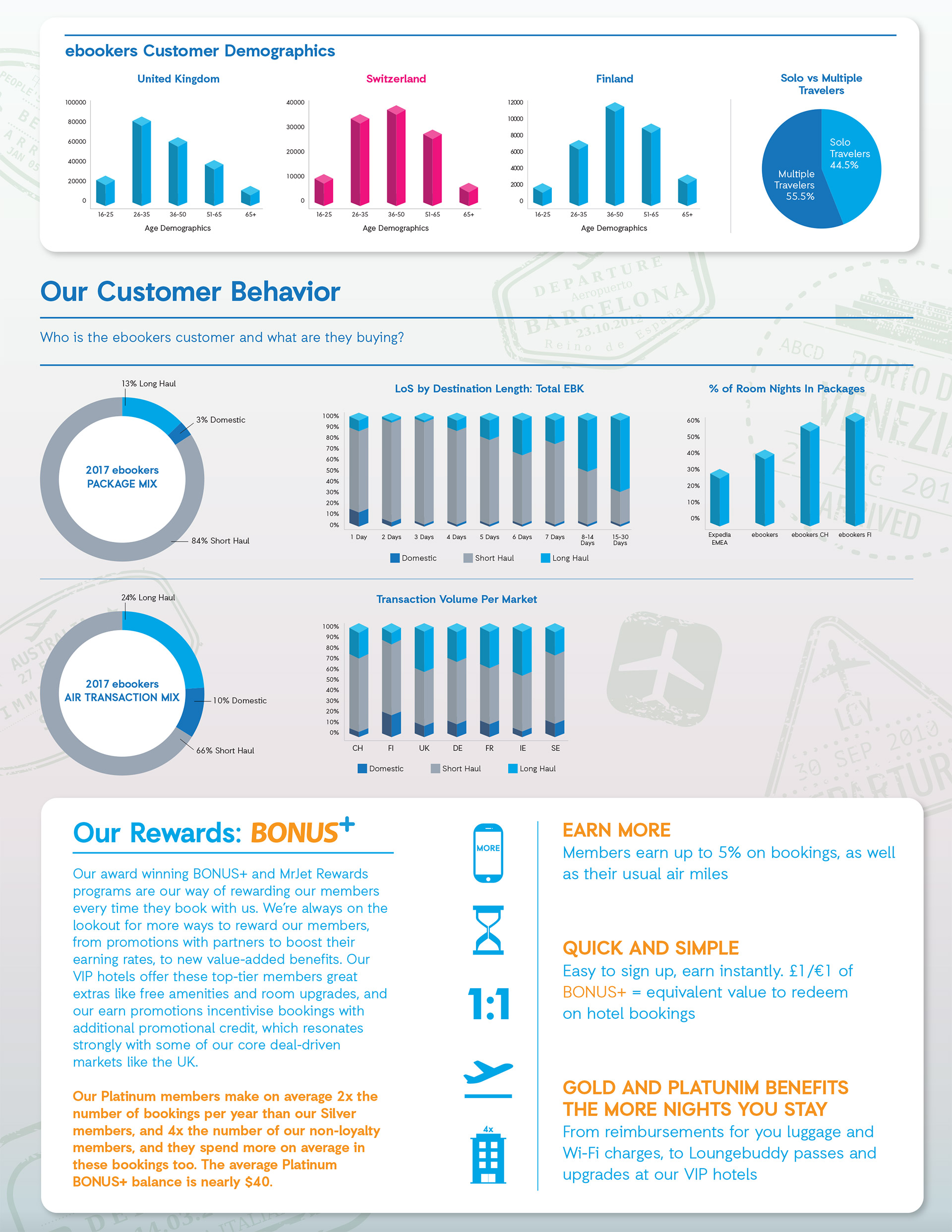 This ebookers brand overview information graphic required a large amount of information data to fit on a single double sided sheet of paper. This brand overview print flyer was handed out to attendees at a B2B conference hosted by Orbitz/Expedia to hotel partners in 2017.
