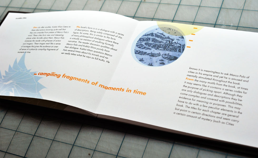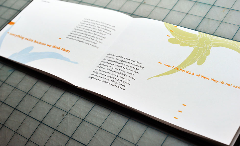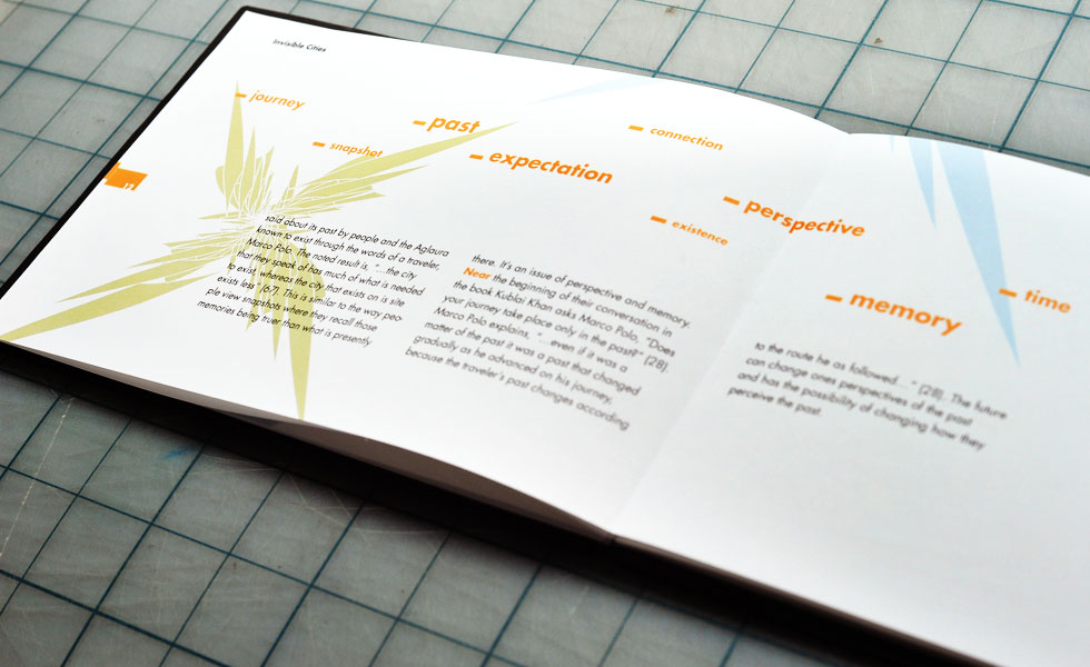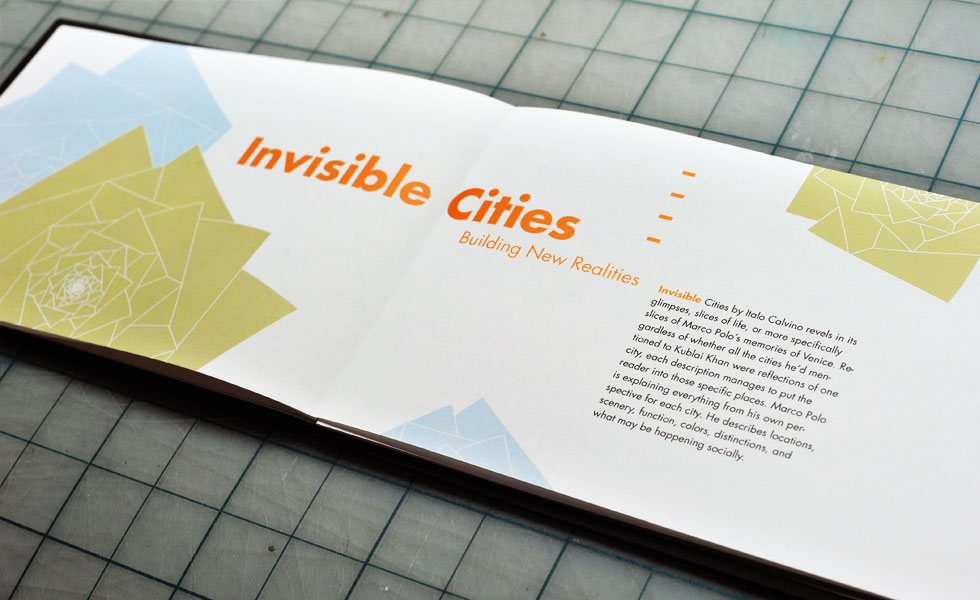 These projects were made as an undergrad at UIC, School of Art & Design (now School of Design). For this graphic design course I wrote an essay on the Italo Calvino book, “Invisible Cities” which was then turned into a book. Another project in the class was to make paper sculptures as a way to experiment with composition in a three dimensional space. I used one of the paper sculptures in a mock promotional poster design. I tried to reflect the themes described in “Invisible Cities” with an emphasis on space, visual patterns, repetition of shapes, and colors.